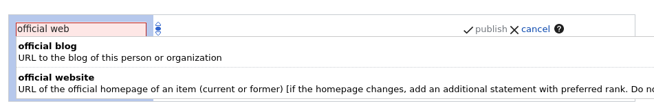 The next important question is how to add new information on Wikidata. The first option is to add it manually. The following screenshot shows how a new statement is added. A contributor wants to add the information: the official website on a Wikidata page. They type the first few characters and Wikidata shows two properties and they can choose any one of them and add the value.