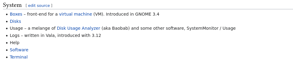But this problem is not limited to KDE applications. All the core applications of GNOME are listed on the English Wikipedia page: GNOME Core Applications. Here too, we see that not all the applications have a dedicated page as seen in the screenshot below.