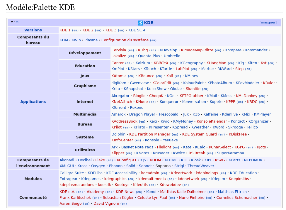 Moving on to the French page: Modèle:Palette KDE, we also see many redlinks.
