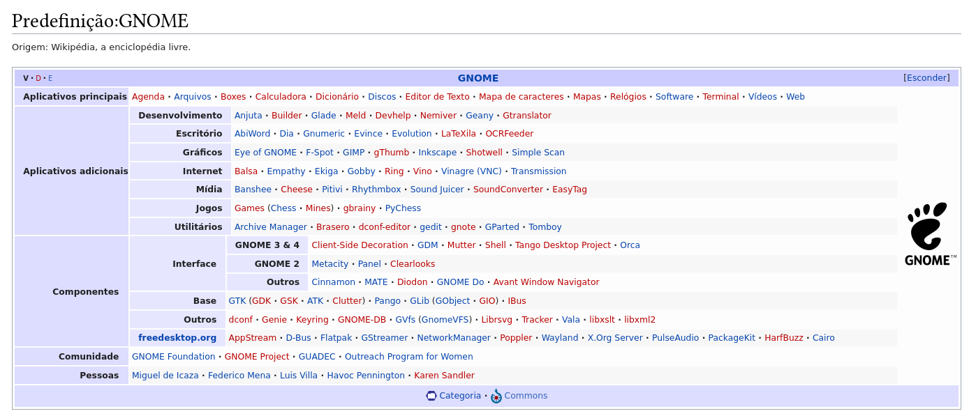 Let's take an example. A template page for the GNOME applications from Portuguese Wikipedia Predefinição:GNOME shows a large number of redlinks.