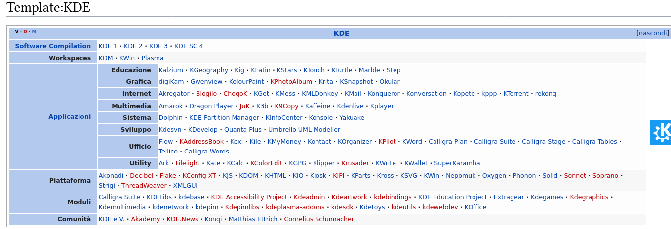 Let us now consider the Italian template page for the KDE applications: Template:KDE. We see several redlinks corresponding to the missing pages for the applications.
