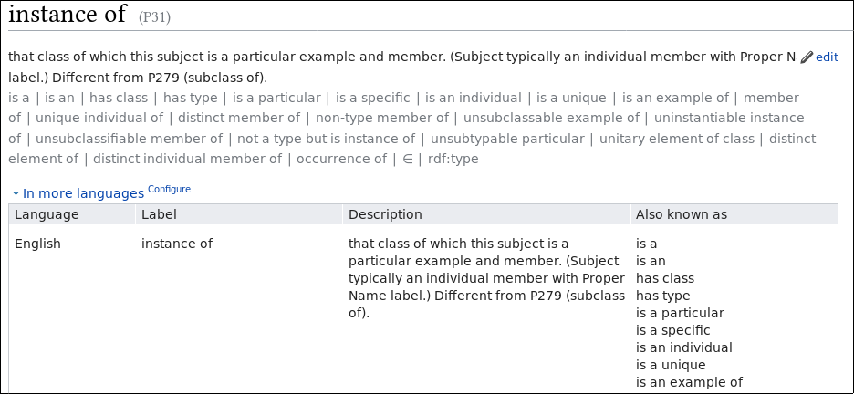 where the different translations can be found. The screenshot below shows the labels, descriptions and aliases of P31, also known as instance of in English. The properties are identified by their P-numbers. We use