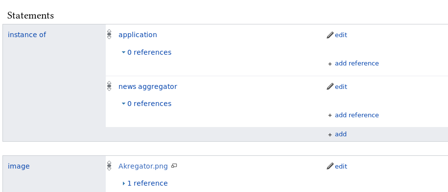 Now our next goal is to see statements about Akregator. We will see how the Q-number of Akregator (i.e., Q1765672) is used to specify the different information. For example, if we want to specify the fact that Akregator is an application and Akregator is a news aggregator, we may need to use the property instance of.
