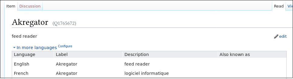 But as described above, repetitive information can be translated into multiple languages. So the same page with a parameter ?uselang=fr will give the French version of Akregator: https://www.wikidata.org/wiki/Q1765672?uselang=fr.
