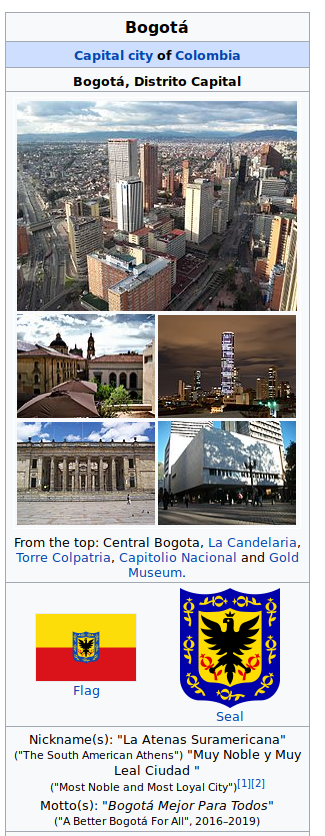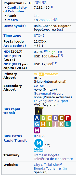 | 1. | Main cities of Colombia | Bogotá (Q2841), Medellín (Q48278), Cali (Q51103), Barranquilla (Q62823), Cartagena (Q657461), Soledad (Q767071), Cúcuta (Q216847), Soacha (Q1011151), Ibagué (Q222755), Bucaramanga (Q243766), Villavicencio (Q749224), Santa Marta (Q209016), Bello (Q816024), Valledupar (Q376903), Pereira (Q51111), Buenaventura (Q996581), San Juan de Pasto (Q320015), Manizales (Q235190), Montería (Q852725), Neiva (Q638260) |