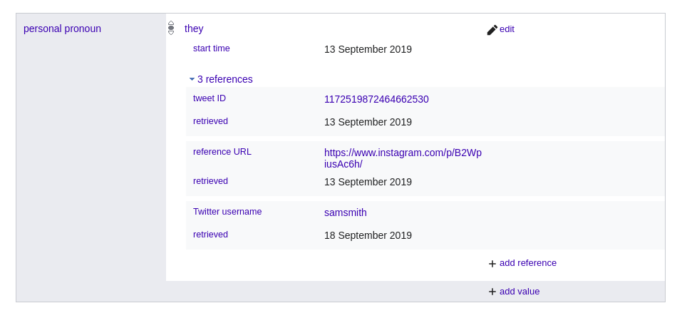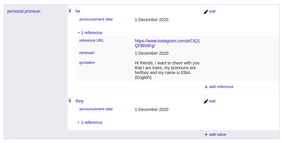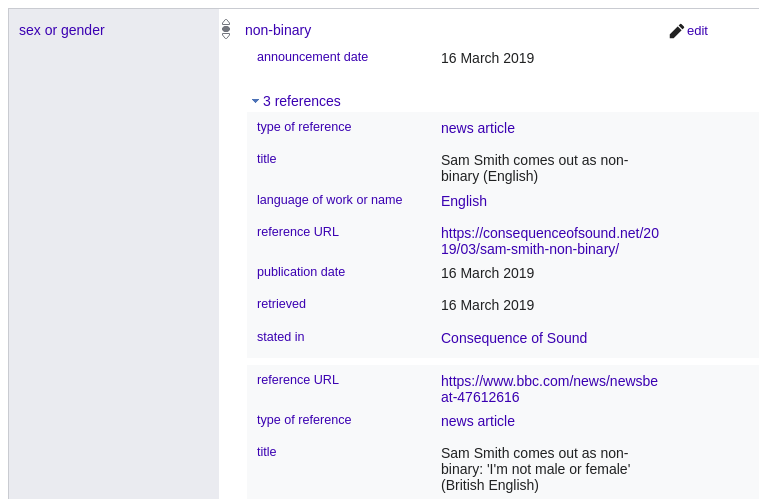 | sex or gender (P21) | Wikidata ID and references |