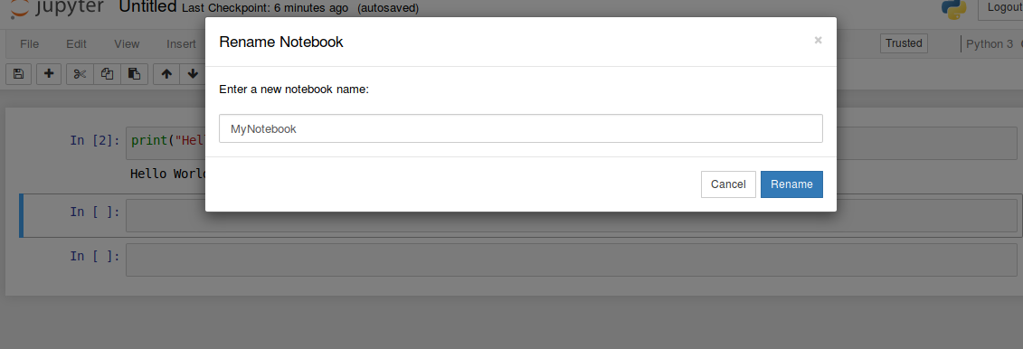 By default, your Notebook is named 'Untitled'. You can rename it as shown below, by clicking on the name 'Untitled' and by giving a new name.